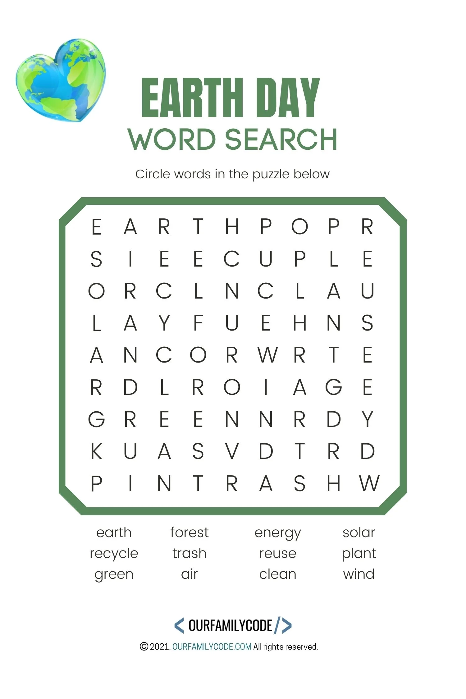 Whether you’re a teacher looking for a classroom activity or a parent looking for a fun Earth Day project for your kids, our printable word search is a great option. Simply download and print the PDF, grab a pencil, and start searching for Earth-friendly words!