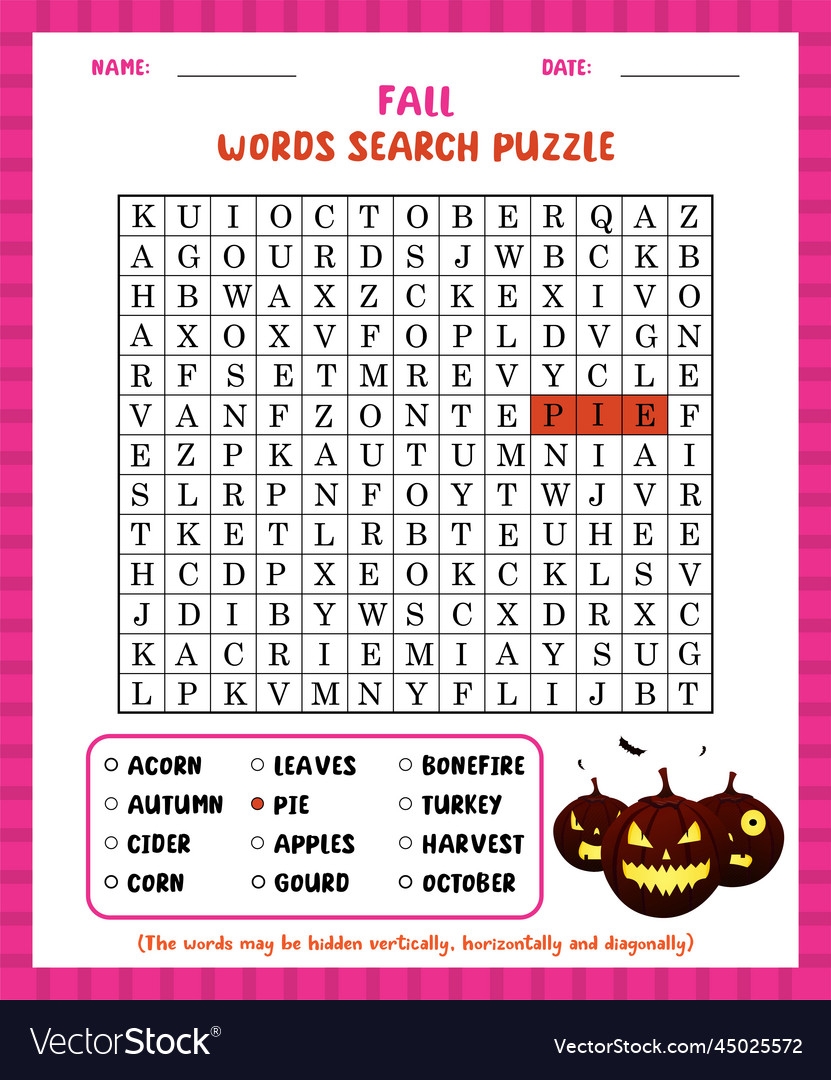 Word Search Game Fall Puzzle Worksheet Royalty Free Vector