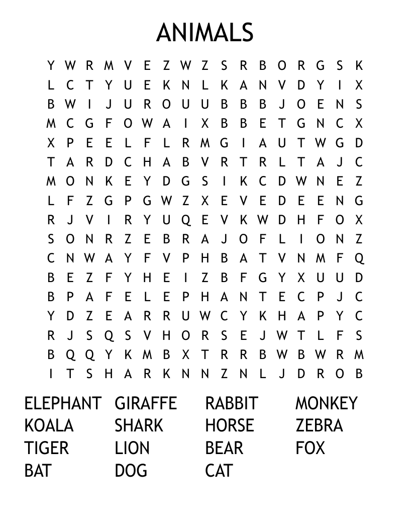 Animals Hard Word Search WordMint