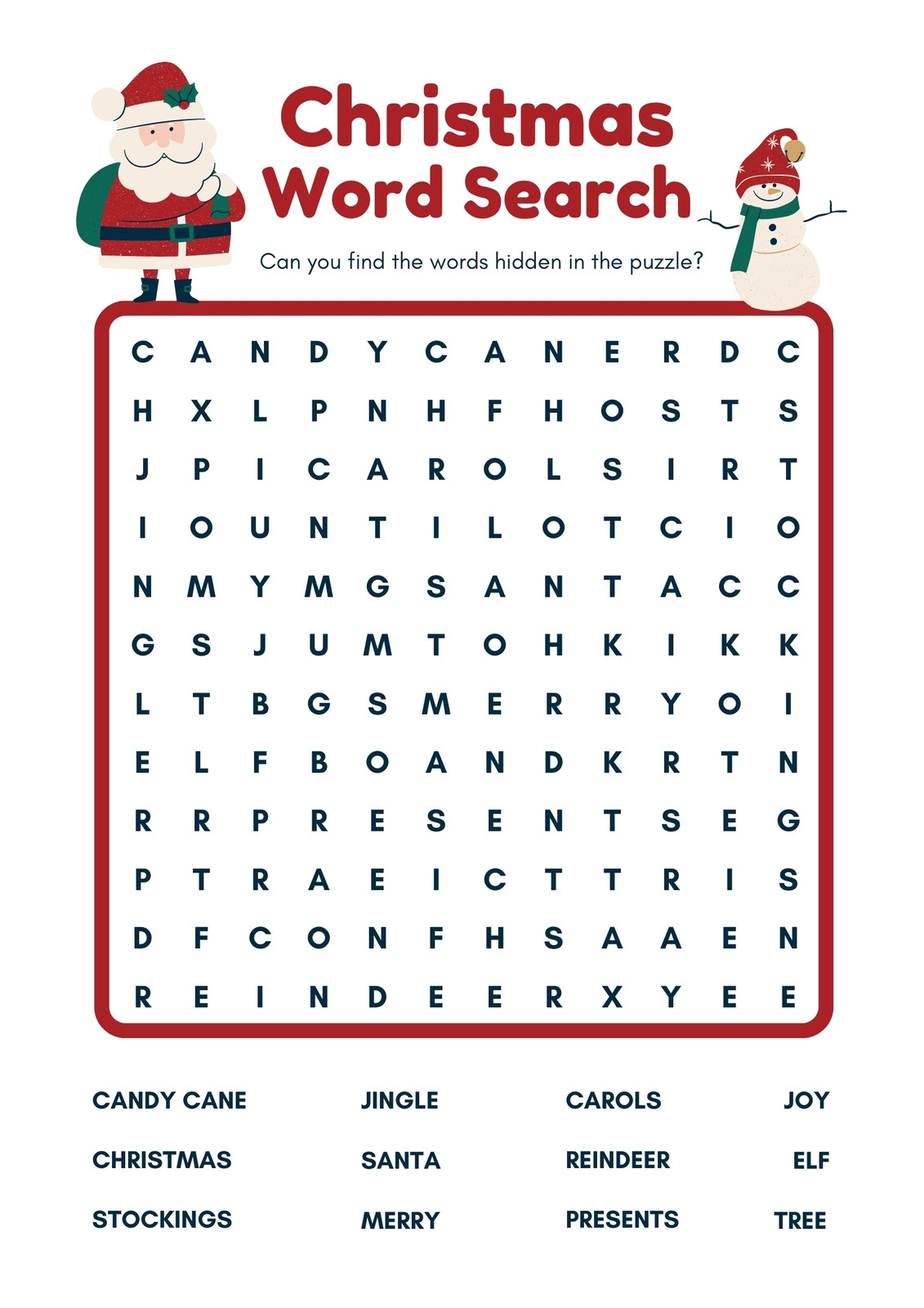 From holiday-themed terms like “Santa Claus” and “Christmas tree” to winter wonders like “snowflake” and “hot cocoa,” these word search puzzles are filled with all things Christmas. You can work on them alone or with friends and family for a jolly good time.
