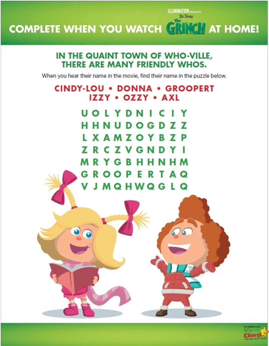 This word search features all your favorite characters from the movie, including the Grinch, Cindy Lou Who, and Max the dog. It’s the perfect activity to keep you entertained during the holiday season or a Grinch-themed party.