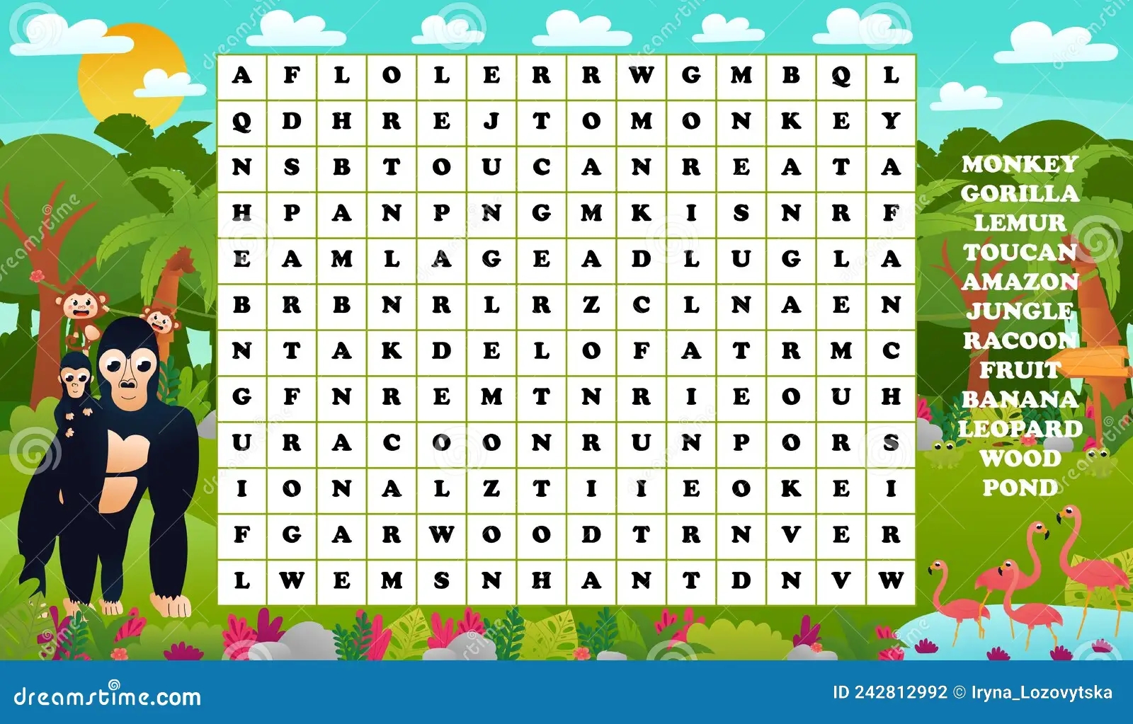 Words Search Puzzle For Kids With Cute Tropical Jungle Forest Animals Gorilla And Monkey Flamingo Stock Vector Illustration Of Game Crossword 242812992