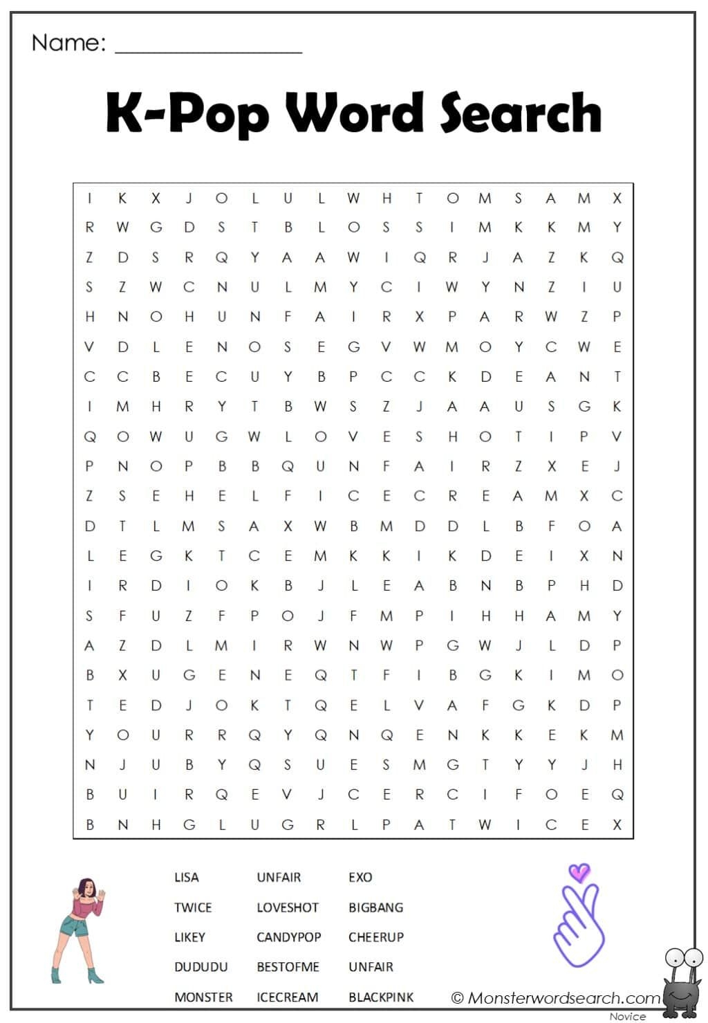 word search puzzle game cartoon monster characters vector worksheet kids quiz grid crossword brainteaser for children with funny aliens mutants and latin letters at square field educational task stock vector image