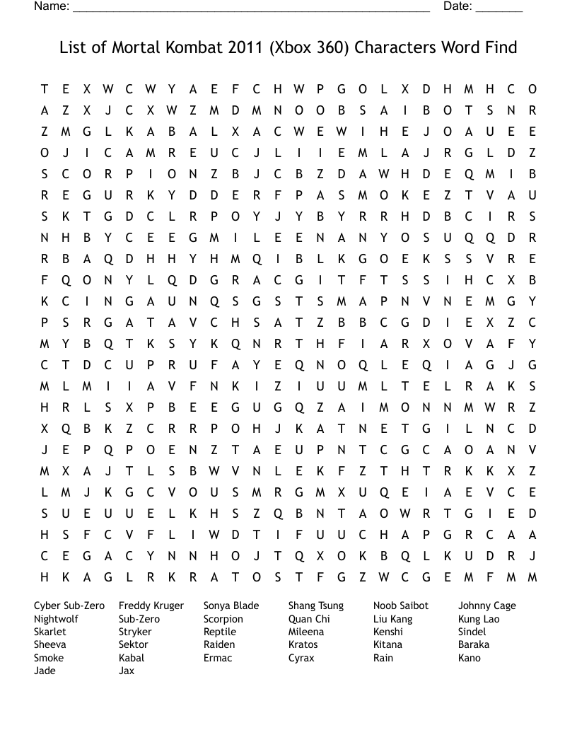 List Of Mortal Kombat 2011 Xbox 360 Characters Word Find Word Search WordMint
