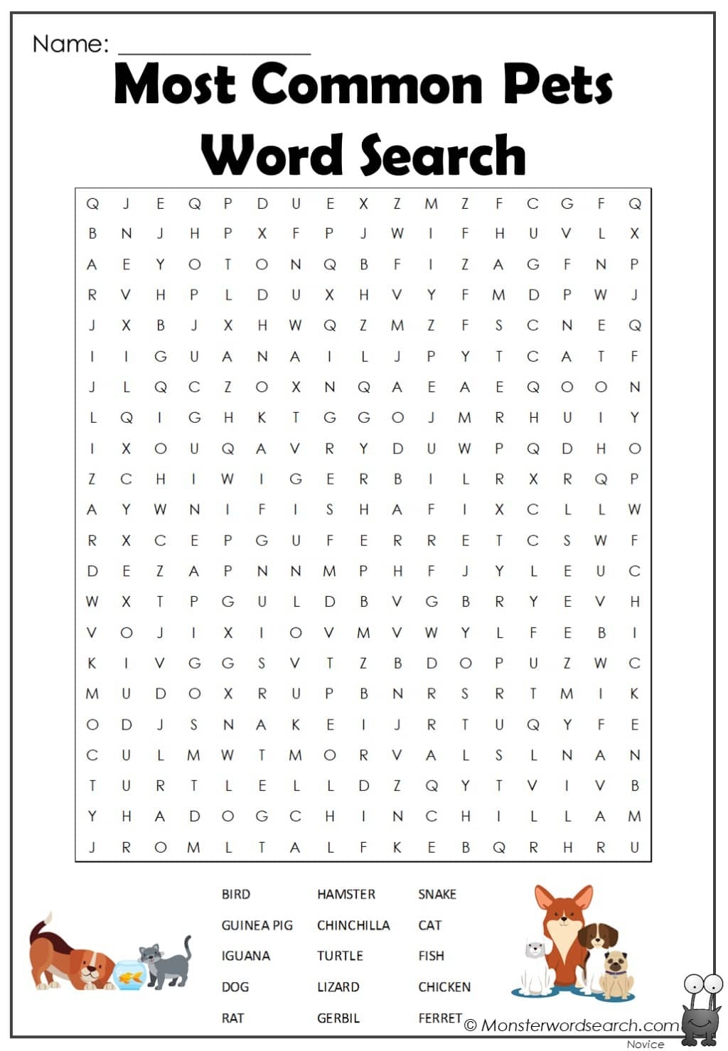 Most Common Pets Word Search Monster Word Search
