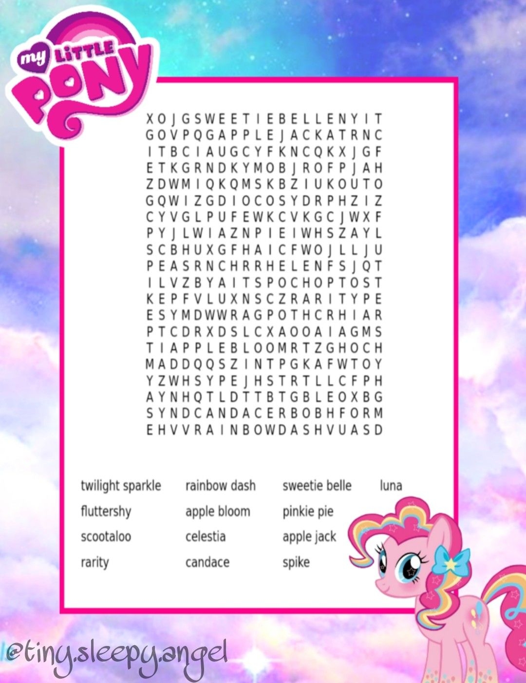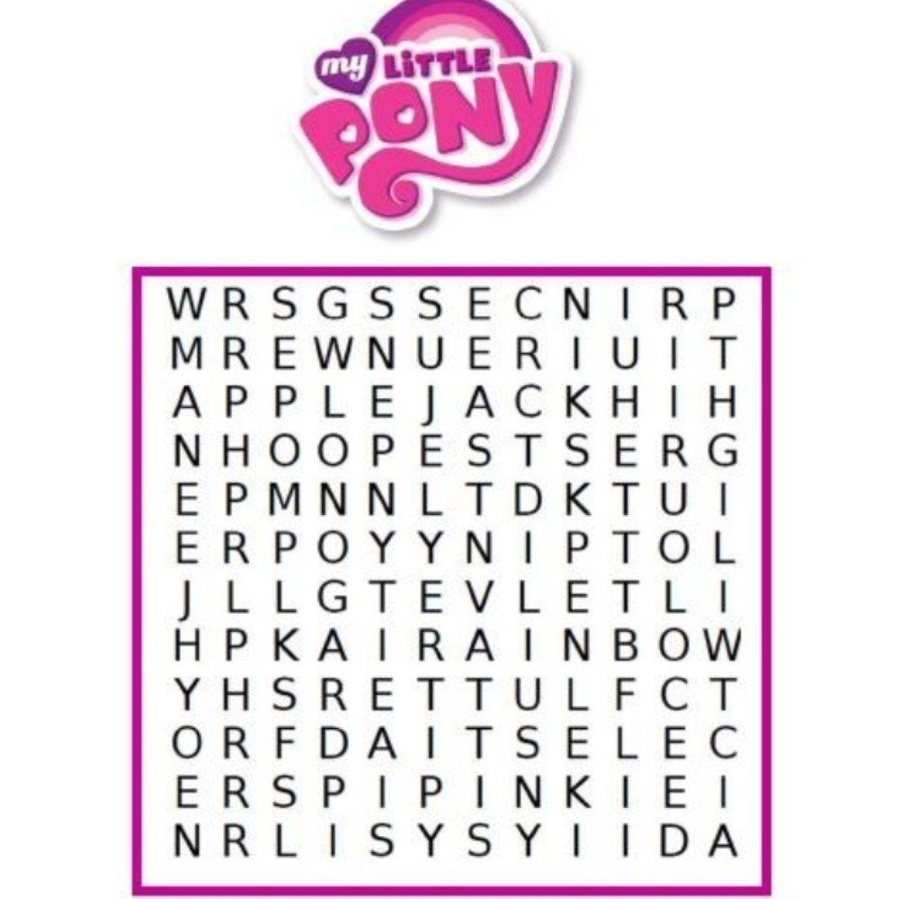 This My Little Pony word search features names of popular characters like Twilight Sparkle, Rainbow Dash, Pinkie Pie, and more. You’ll have a blast searching for these names hidden among the letters. Grab your favorite markers or pencils, and get ready to embark on a pony-filled puzzle adventure!
