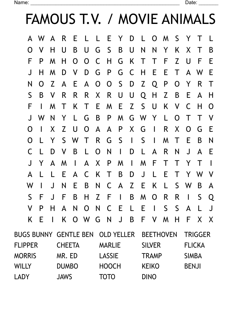 FAMOUS T V MOVIE ANIMALS Word Search WordMint