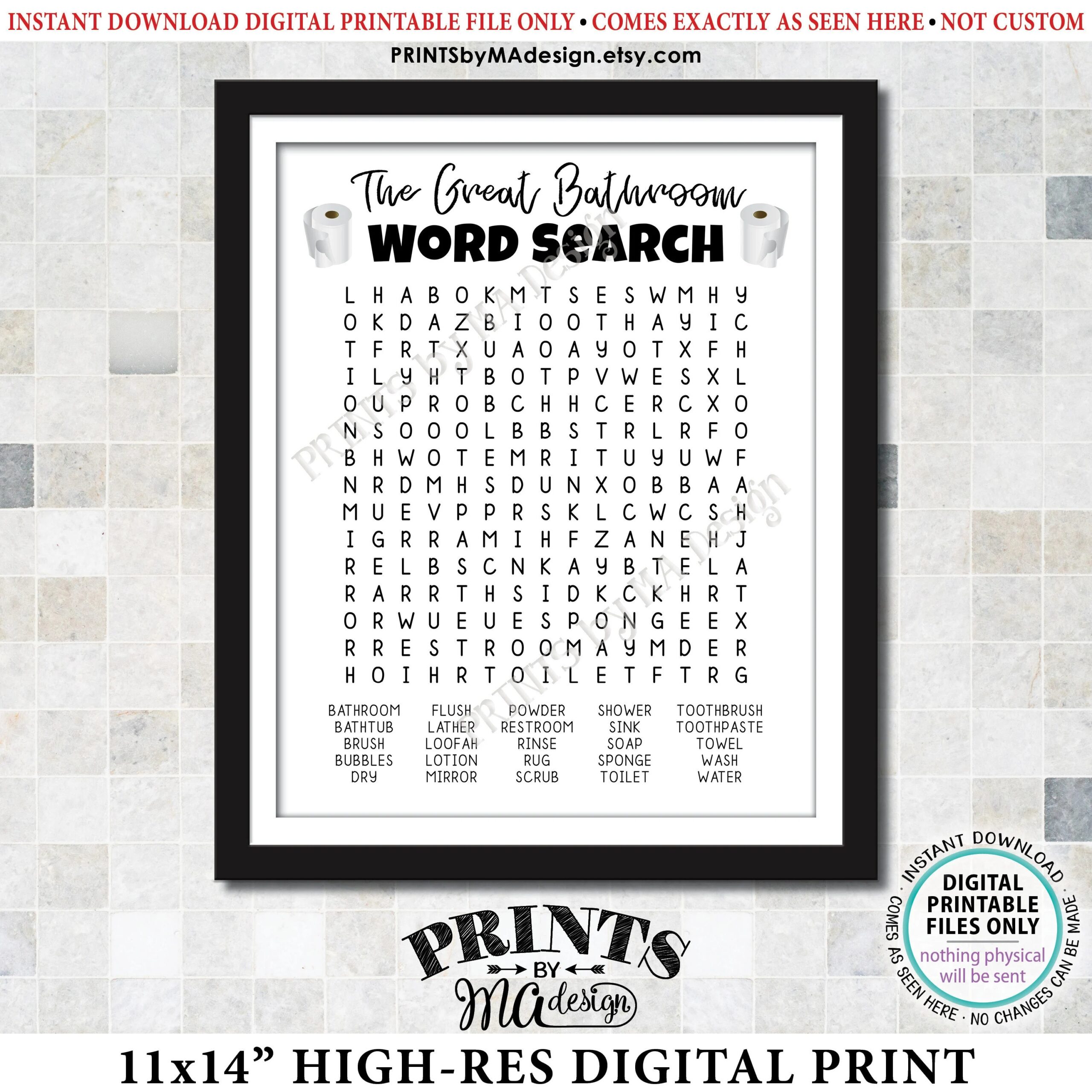 The Great Bathroom Word Search Fun Bathroom Puzzle Silly Housewarming Gift Toilet Paper PRINTABLE 11×14 Sign