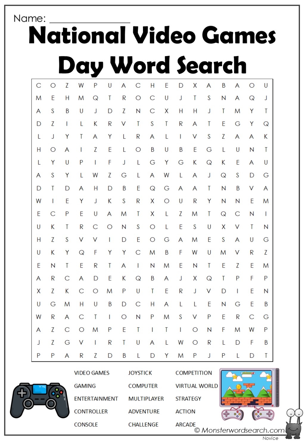 National Video Games Day Word Search Monster Word Search