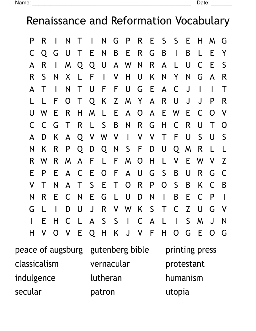 Renaissance And Reformation Vocabulary Word Search WordMint