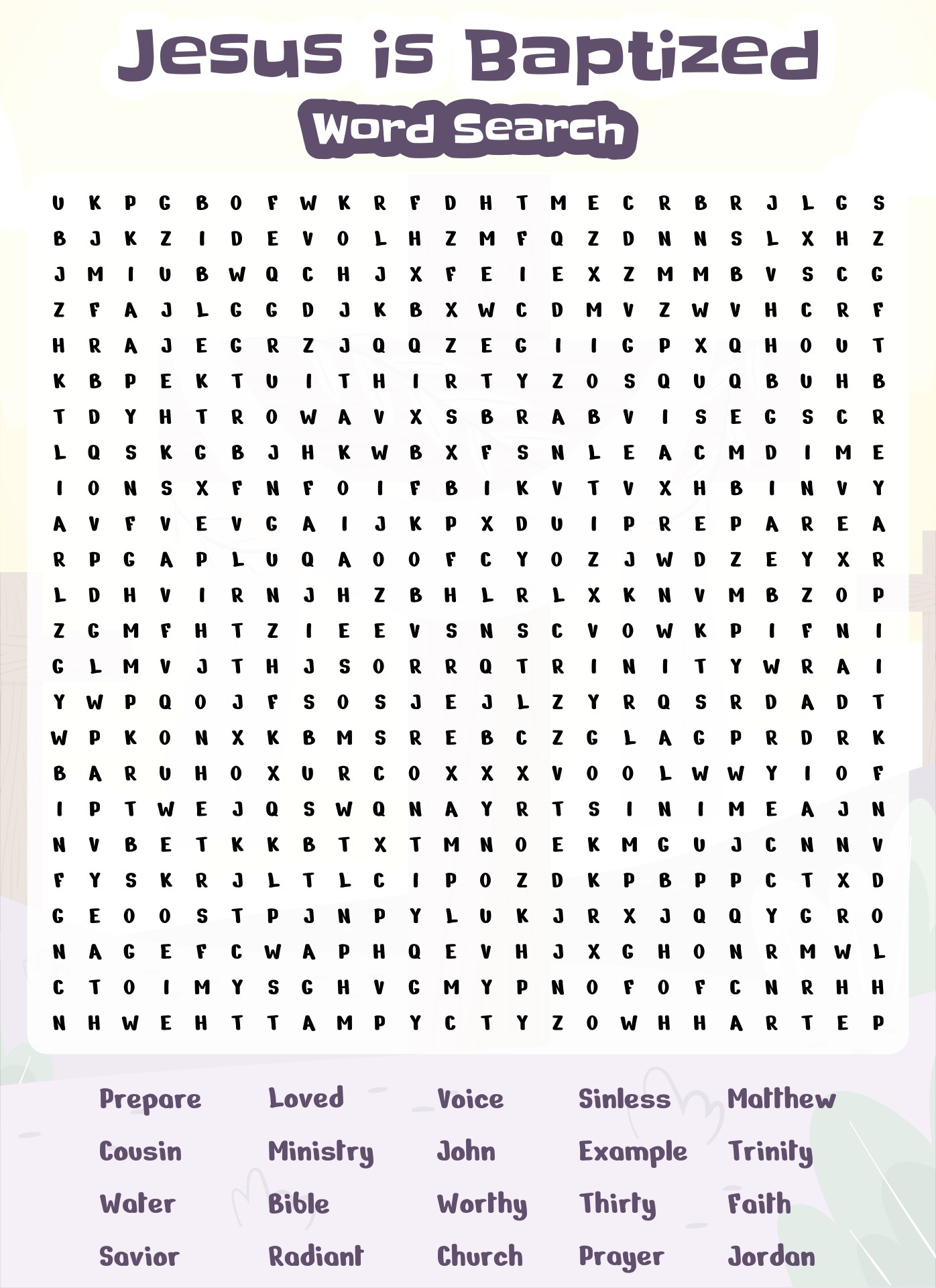 Printable word searches are a fantastic way to help kids improve their spelling, vocabulary, and cognitive skills. Plus, they’re a lot of fun to do! And with this word search about Jesus’ baptism, your kids can learn about the significance of this event while having a great time.