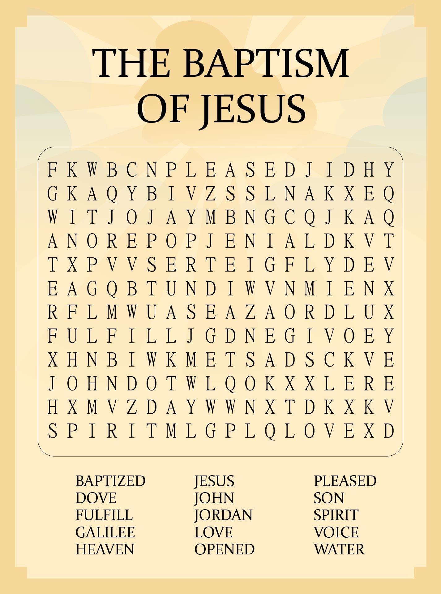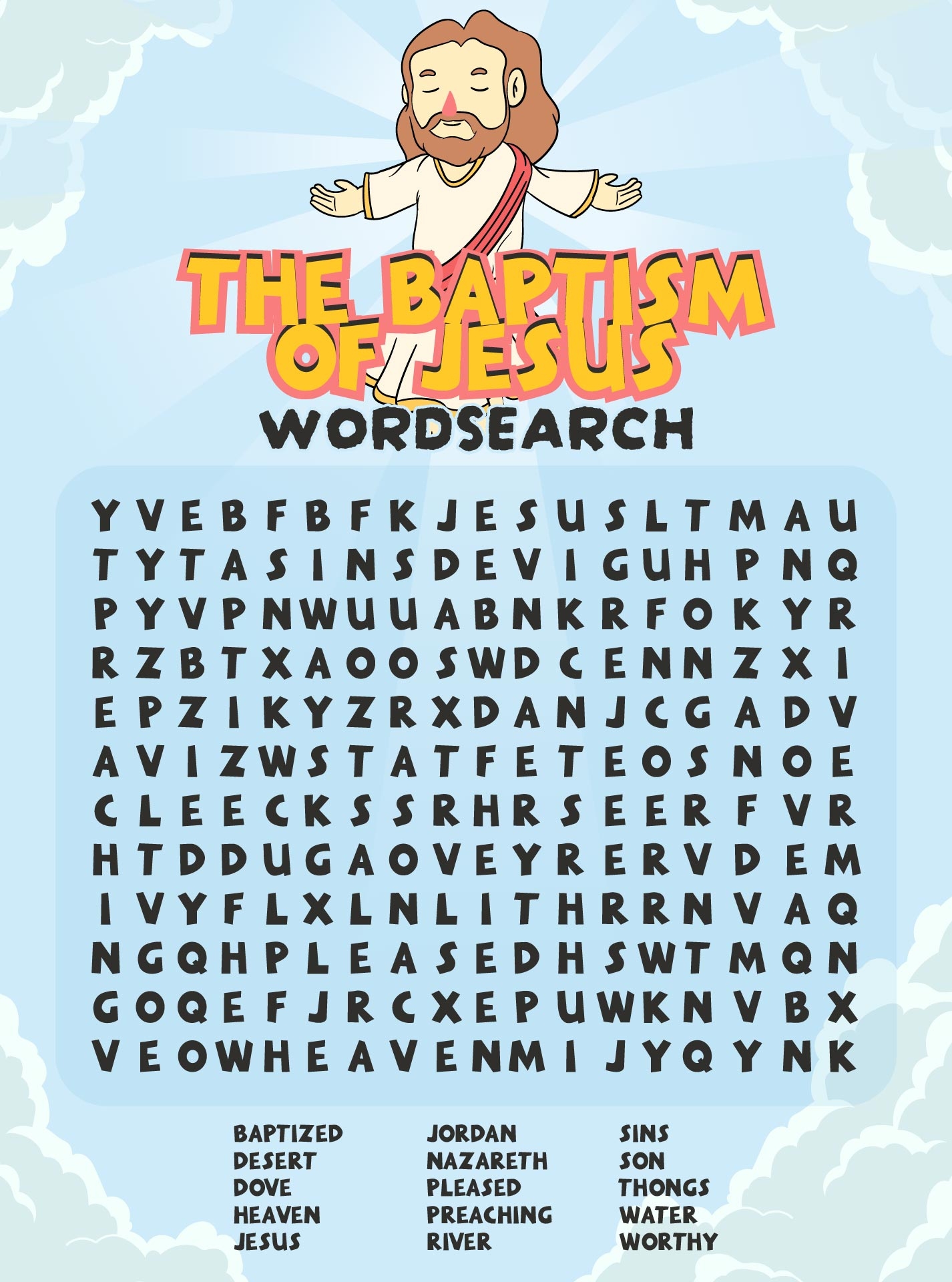 So why not print out this word search today and enjoy some quality time with your children? They’ll have a blast searching for the hidden words while learning about the baptism of Jesus. It’s a win-win for everyone!