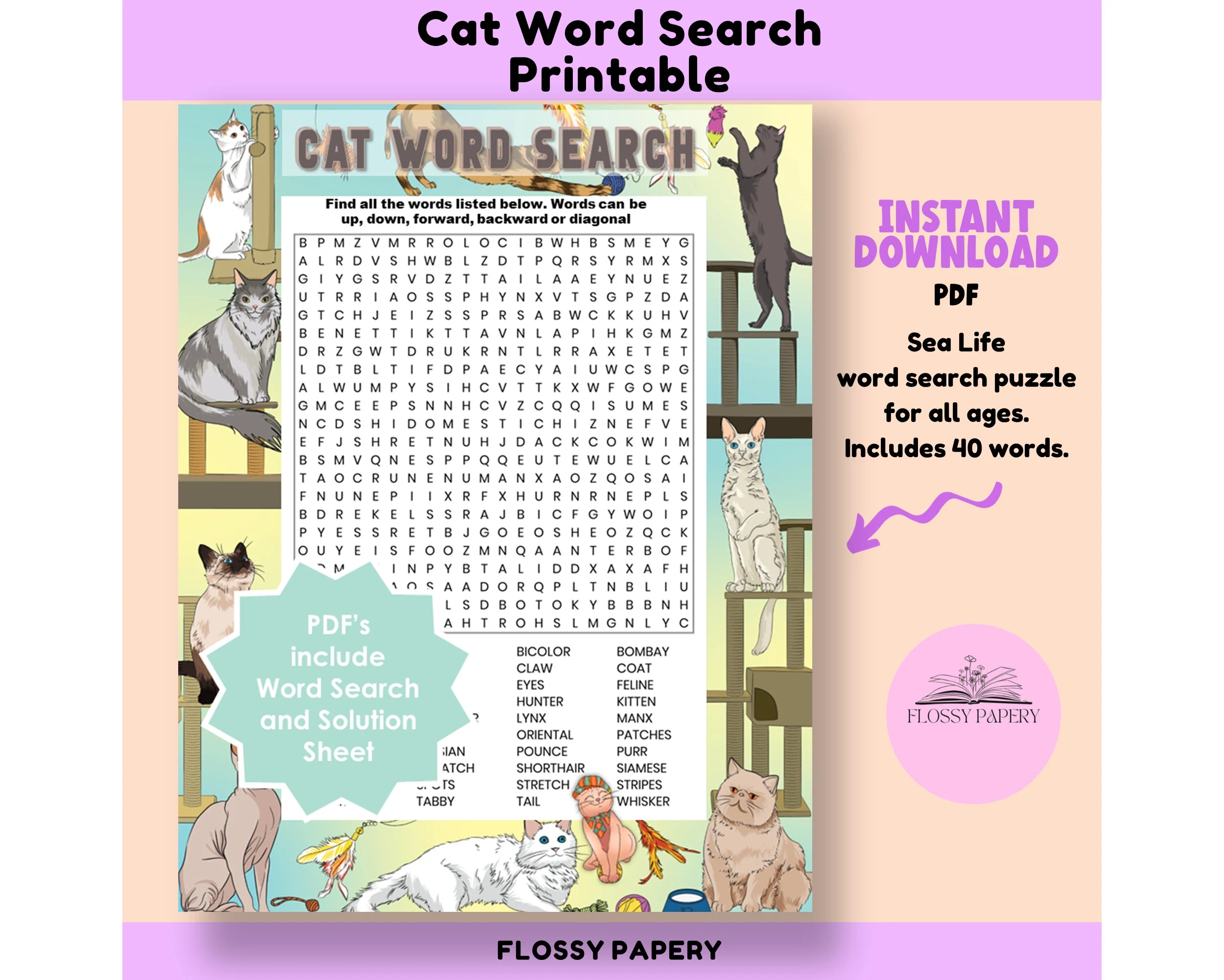 Cat Word Search Printable PDF Large Word Search Puzzle Etsy