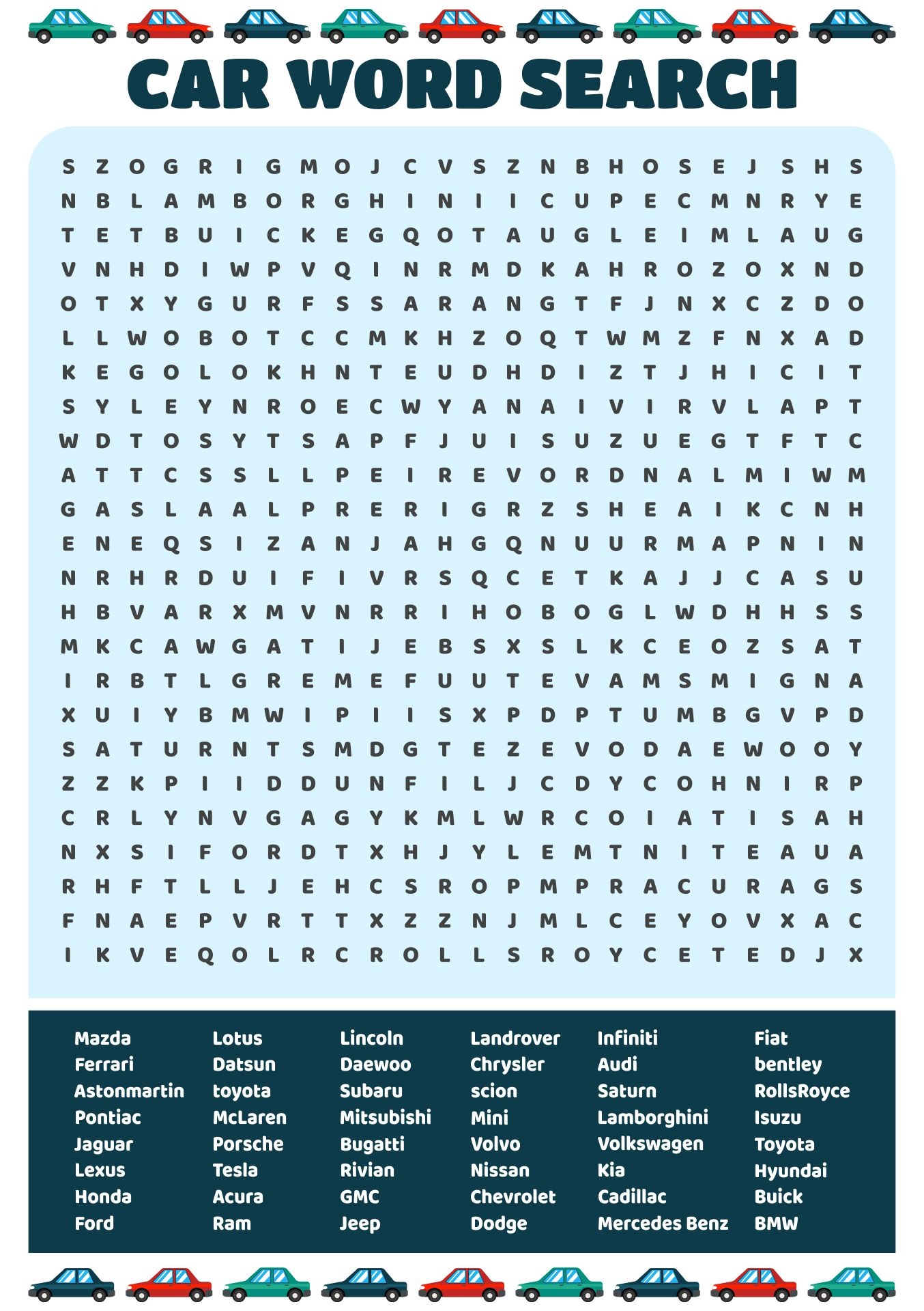 Once you’ve completed the word search, don’t forget to check your answers to see if you found them all. You might discover some new car models along the way or reignite your passion for fast cars. Either way, it’s a fun and engaging activity for car lovers of all ages.