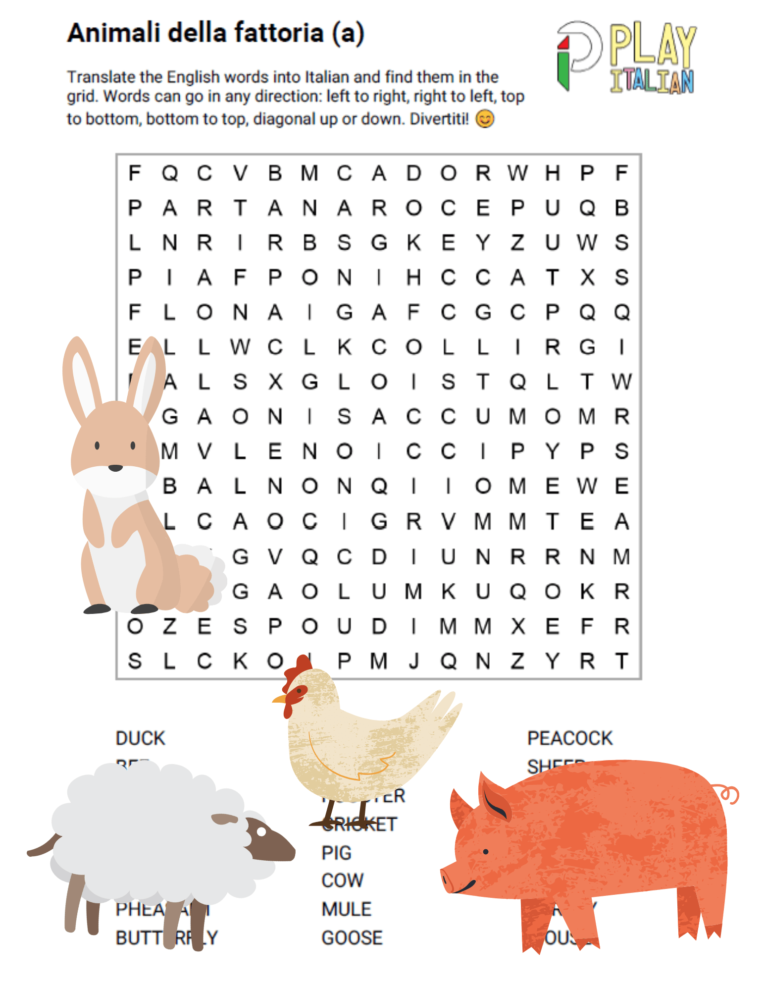 Animali Della Fattoria Italian Printable Word Search