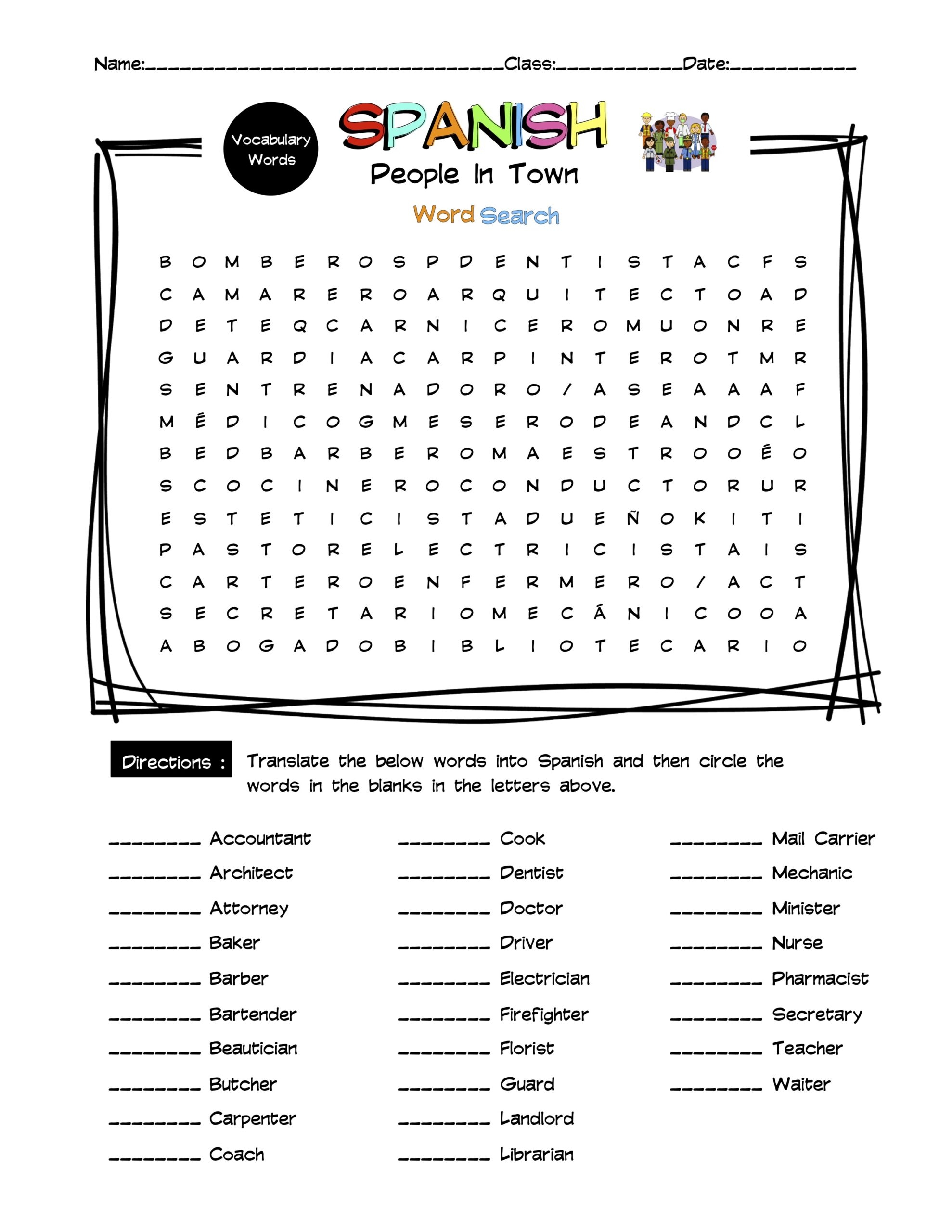 Spanish People In A Town Vocabulary Word Search Answer Key Made By Teachers