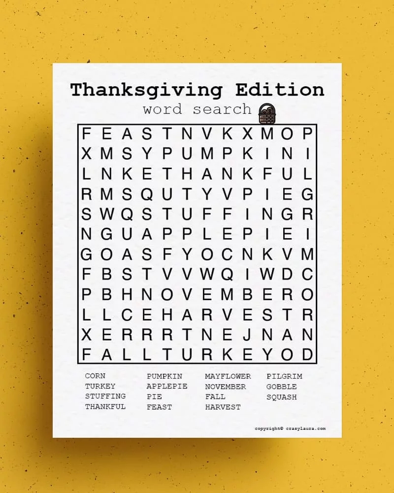 With words like turkey, pumpkin, and family hidden in the puzzle, everyone can join in on the excitement. Simply print out the word search, grab a pen or pencil, and start hunting for those festive words!