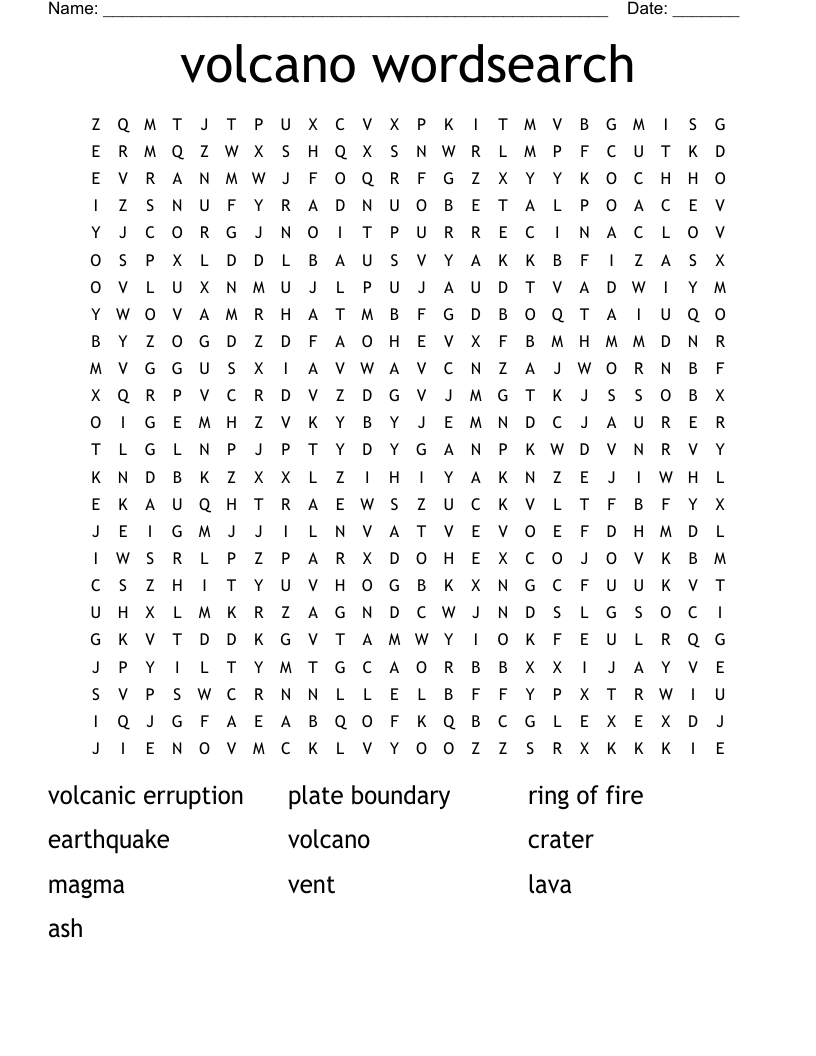 Print out the volcano word search puzzle and challenge your kids to find words like lava, eruption, magma, crater, and more. As they search for the hidden words, they’ll improve their spelling and concentration skills while having a blast!