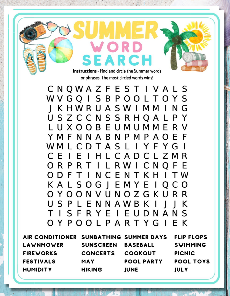 Summer Word Search Printable Game Party Kids Adults Activity Worksheets Library