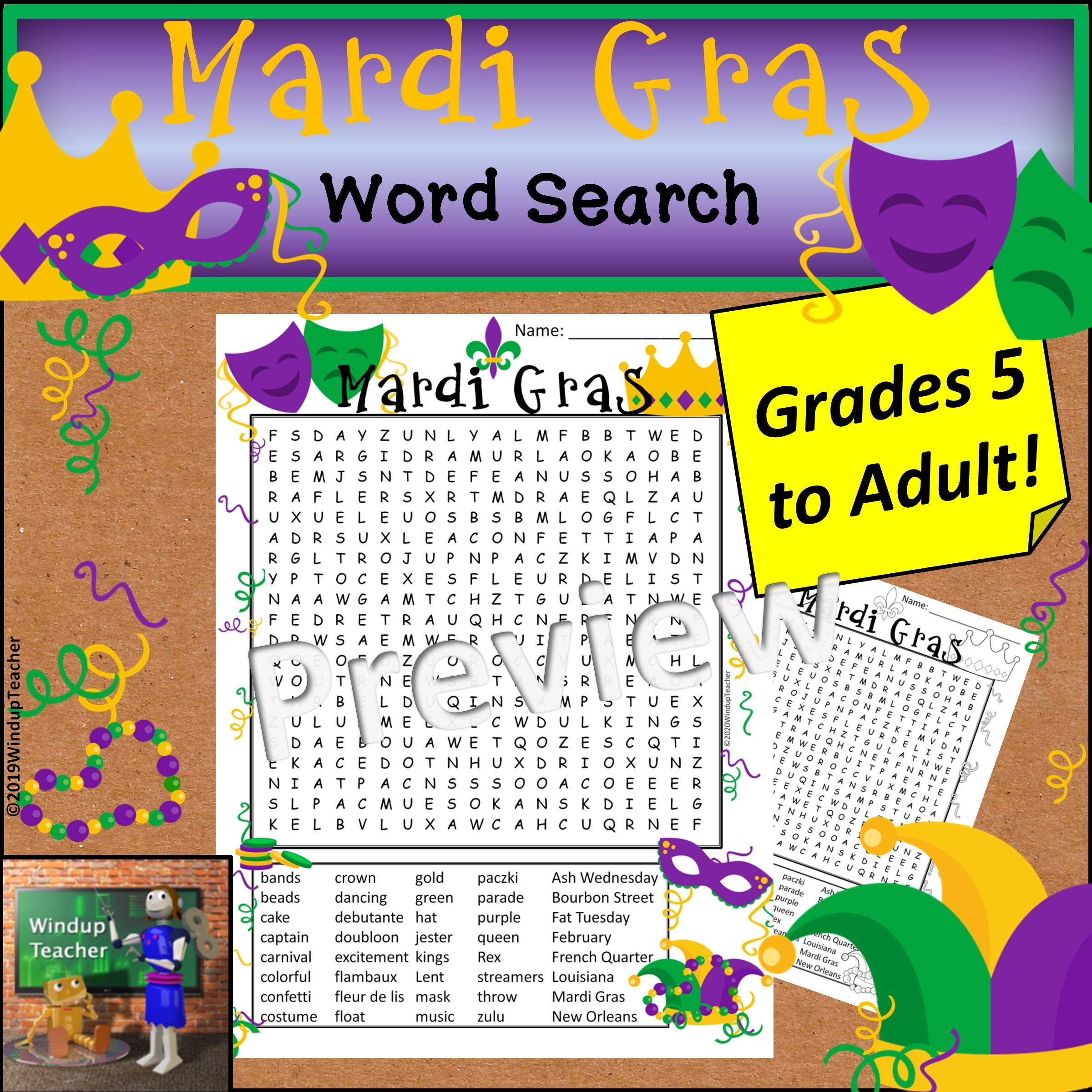 Mardi Gras Word Search Hard Grades 5 UP Made By Teachers
