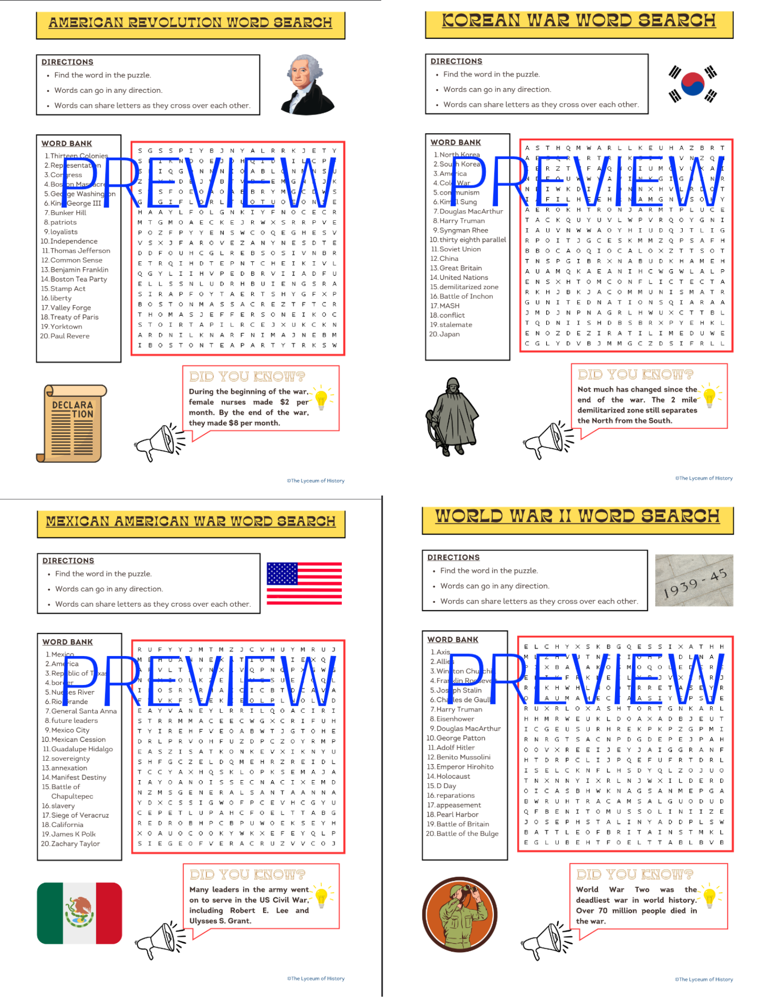 American Wars Word Searches Classful